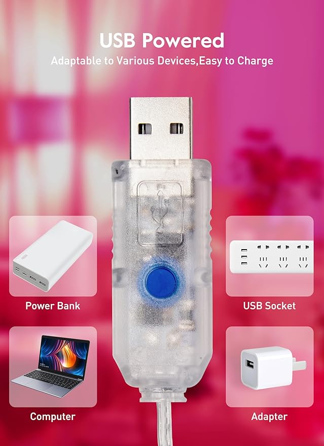 - Upgraded Beautiful Fairy Lights: Introduce a stunning LED pink light string, consisting of 33 feet of flexible copper wire and 100 energy-saving LED bulbs, USB-powered fairy lights emit a soft light, suitable for indoor and outdoor use. With the remote control, you can easily turn on and off the lights, control the brightness, and adjust the lighting mode. Make it the perfect embellishment for your home decoration.