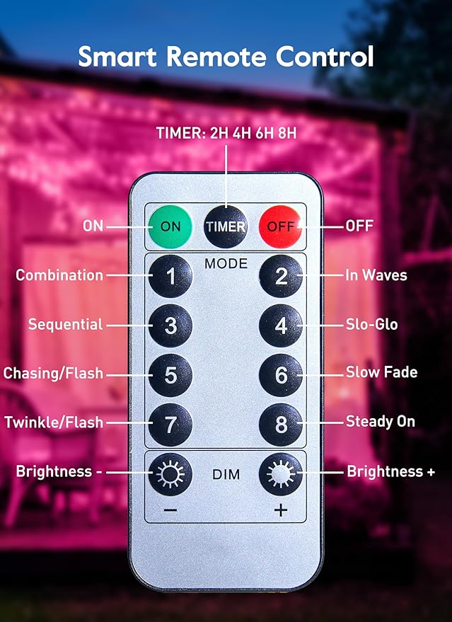 - Timer & 8 Lighting Modes: The timer function for 6 hours on / 18 hours off, which will cycle automatically for 24 hours; This string of lights has two control methods, you can use the USB control to change this lighting mode or use the remote control to change the fairy lights' brightness; This string of lights has eight different lighting modes, including combination, wave, continuous, slow fading, chasing flash, gradually disappearing, flashing, and always on