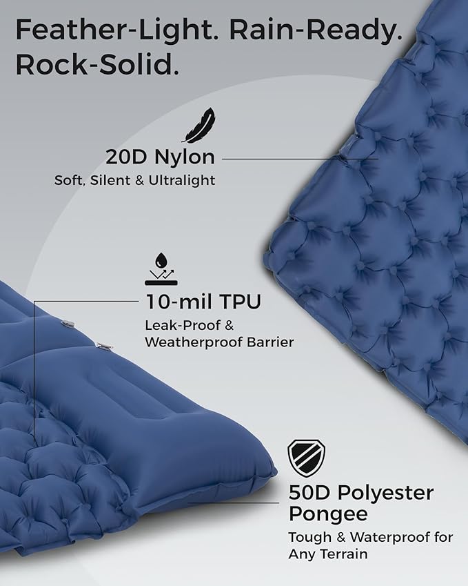 - 20D Nylon Top + 50D Polyester Pongee Bottom – Lightweight Comfort Meets Rugged Durability: Our top layer uses 20D nylon laminated with 10-mil TPU, creating a lighter, quieter surface than the 40D nylon found in many pads—helping cut weight without losing comfort. The bottom features 50D polyester pongee, highly water-resistant to block moisture and tough enough for rough terrain. This dual-layer build delivers soft comfort above and durable protection below, ideal for outdoor use.