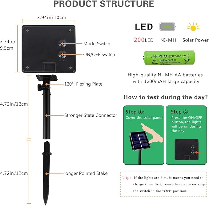 - 8 Lighting Modes, Memory Function and Auto On/Off: These solar twinkle lights have the on/off button and mode button. You can select 8 different modes to satisfy your diverse needs by pressing the mode button.And the built-in memory chip saves your last modes setting, so there is no need to reset it again