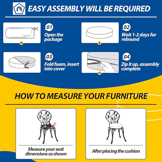 - Wide Use & Tips: These outdoor dining chair cushions fit pools, patios, balconies, decks, backyards, and gazebos. Foam inserts and covers are packed separately in bags and placed in one box—check all parts. Easy assembly required