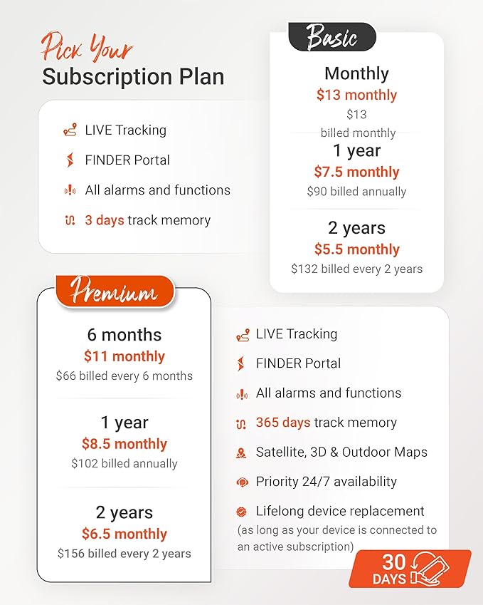 - SUBSCRIPTION: Includes a SIM card and offers a lifelong device replacement, along with 24/7 customer support in multiple languages. Control your locators with our free app compatible with Android and iOS and share it with the whole family. Choose between the Premium or Basic plans, with options from monthly to every 2 years, from $5.50 per month, with payment frequency depending on the duration of the subscription. See pricing details in images.
