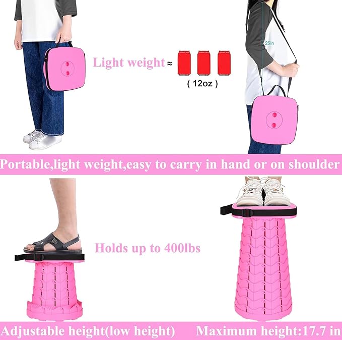 - [Foldable, Adjustable height ]: The folding camping stool to open and close easily in just seconds, lock in place with slight rotation, easy installation. The height can be adjusted freely between approximately 2.56 inch and 17.7 inch, It is applicable for all adults, it is also perfect for sending as a gift for family, friends, relatives.