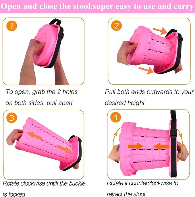 - [Easy to use, Multipurpose]: Super easy to use. You can open the collapsible stool by holding both ends and pulling to open with slight turning them, perfect for indoors and outdoors. Indoor occasions such as the living room, bedroom, bathroom, kitchen, office. Outdoor activities: drawing room, garden, hiking, BBQ, camping, queue, fishing, kitchen, etc
