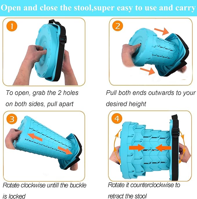- [Easy to use, Multipurpose]: Super easy to use. You can open the collapsible stool by holding both ends and pulling to open with slight turning them, perfect for outdoors: drawing room, garden, hiking, BBQ, camping, queue, fishing, kitchen, etc
