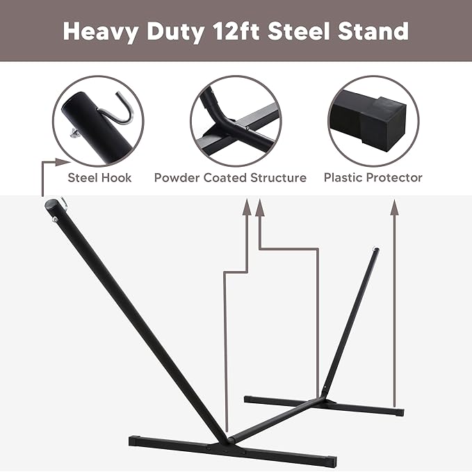 - Freestanding Hammock with Portable Stand: No damage to trees. Created to be stable and long-lasting, the 12 ft stand is made from powder-coated heavy gauge steel. It can be easily assembled in minutes without any tools, and it could be disassembled easily, making it to be a portable hammock. Feel free to contact us if you have any questions during use within one year of purchase. We are always here to help