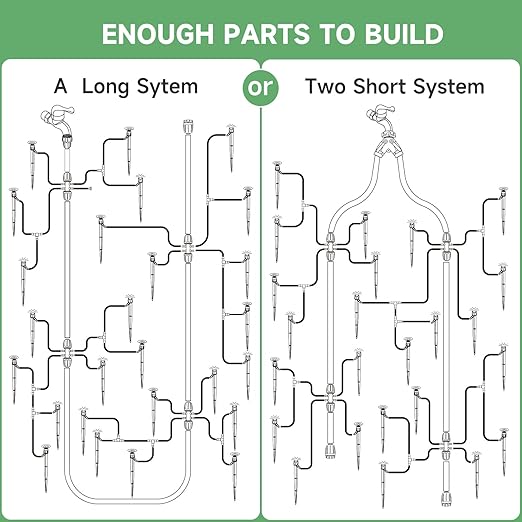 - Upgraded Main Tubing: Designed to withstand high water pressure, our enhanced 1/2" diameter main tubing ensures a reliable and constant water flow. Easily split the 40FT tubing to form two systems, each with its own faucet connector for dual setup convenience.
