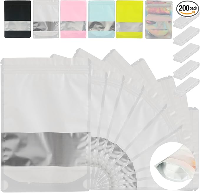 200 Pcs Mylar Bags for Food Storage 4x6 Mylar Bag with Window, Foil Stand Up Resealable Bags for Food, Smell Proof Bag Freeze Dried Candy Packaging Sealable Pouch Jewelry Bracelet Pouch White