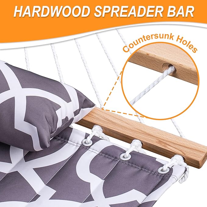 - STRONG HARDWOOD SPREADER BAR: This hammock has 2 pieces of 55-inch strong hardwood booms on both sides with an oil rubbed finish that is stylish and weather resistant. Each hardwood boom has 18 holes to minimize friction between the rope and boom