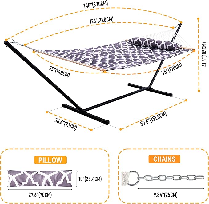 - EXTRA-LARGE HAMMOCK FOR OUTSIDE: The whole hammock is 12 ft with steel chain links, 9.84 ft from loop to loop; the hammock bed surface is 75 inches long x 55 inches wide, enough to support 450 pounds. You can enjoy leisure time in the hammock with your partner, your kids or your friends. And it's perfect for patios, gardens, backyards, poolsides, balconies and more