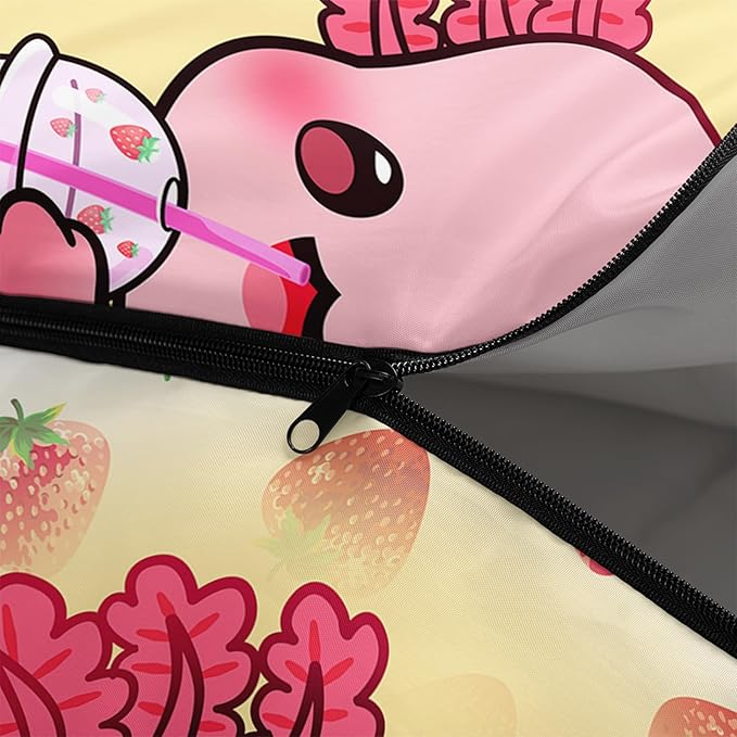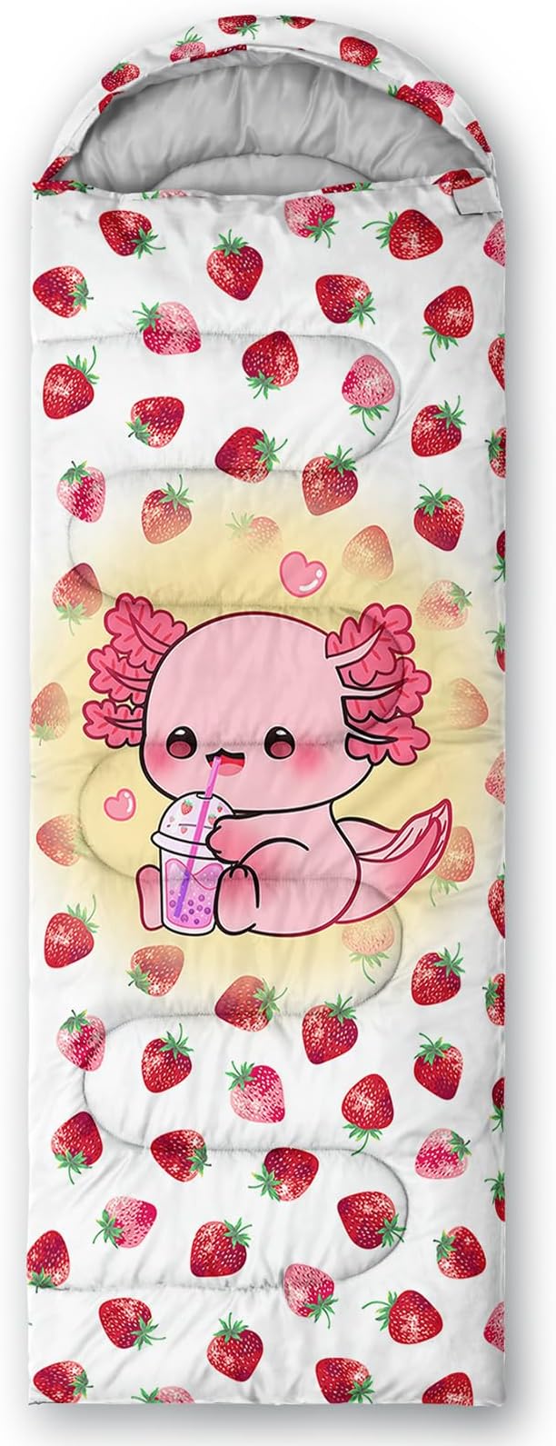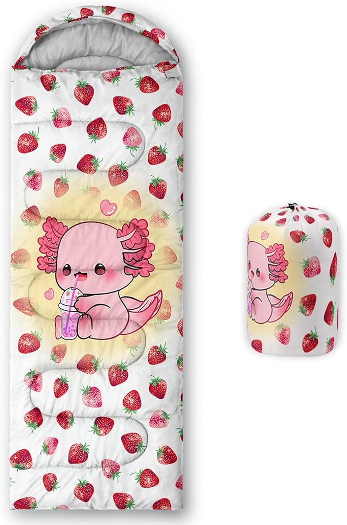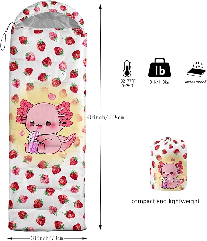 - 【Fits For 3 Seasons】: Size - 31 by 90 inches (W x D). Our Cartoon Strawberry Axolotl sleeping bag can be used in 3 seasons with a design temperature of 32℉-77℉(0℃-25℃). These Sleeping bags also have a weather resistant waterproof design to keep you warm and prevent you from any dampness.
