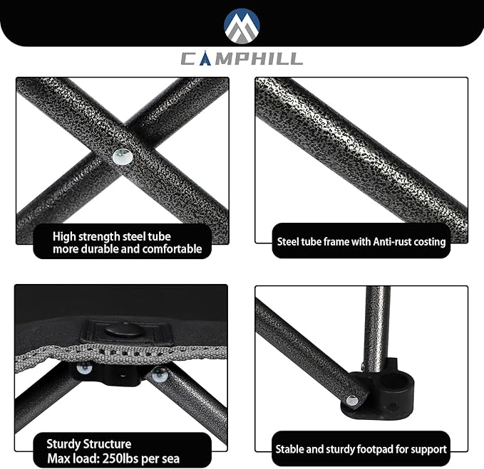 - 【Sturdy and Durable】:Camphill camping chair set is built with a heavy-duty powder coated steel frame. The sofa supports 500 lbs. (250 lbs each side) and measures 35”H, 37.4”L, 19.3”D (open). The chair supports 300 lbs. and measures 35”H, 19”L, 19”D (open).Oversized camping chair set is designed to provide ample space for relaxation.