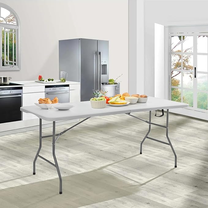 - ✅【Fold-in-half Design】: This folding table 6ft can be open and folded from the center in a few seconds. It has side safety buckle and retractable legs. So its biggest advantage is that it is convenient for people to use and carry indoors or outdoors. Weight Capacity: 330 lbs. The opening size: 70.8"(L) x 29.1"(W) x 29.3"(H);