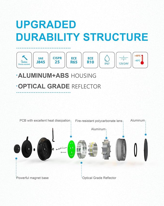 - 【MAGNETIC BASE】This magnetic flashing safety light for trucks is suitable for all vehicles; features a strong magnetic bottom with 6 magnetic pods and protective rubber feet; easy to install on any external metal