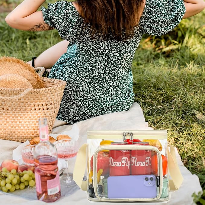 FlowFly Insulated Reusable Lunch Bag Adult Large Lunch Box for Women and Men with Adjustable Shoulder Strap,Front Zipper Pocket and Dual Large Mesh Side Pockets,Clear#Biege