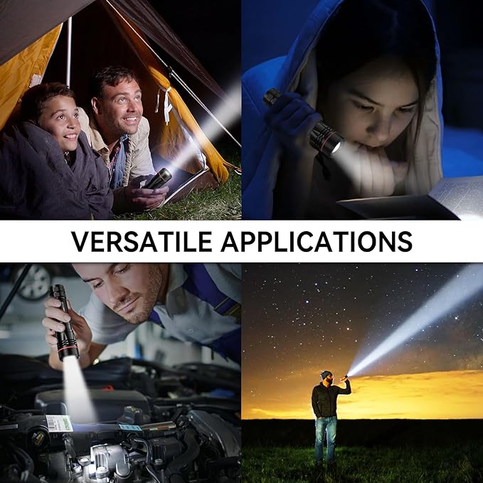 - Tactical Compact Flashlights: These small flashlights with 4.7’’ height and 106g, lightweight enough to carry comfortably and easily fit in your pocket, backpack, purse or car console compartment, ensuring convenient storage and quick access. Keep at home for emergency backup or to use outside, such as dog walking, camping, hiking, fishing, etc