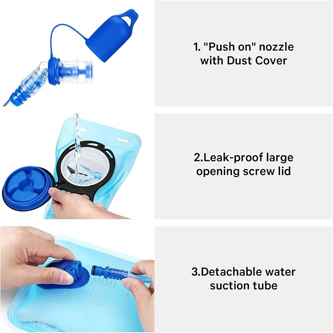 - High-Flowing Hose Design:To prevent water leakage when not in use, we've designed a push-on straw tip of hydration backpack. Follow these steps:push on the tube tip,then gently bite the water outlet with your teeth.This easily allows for a high-density flow, quickly replenishing water when thirsty.