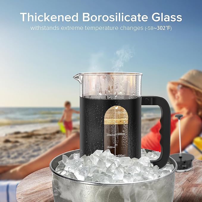 - 【EASY TO USE】Brew a cup of coffee in several minutes. The 34oz/1000ml french press makes the perfect cup of coffee. The french press coffee is the easiest to concentrate on the condition of the beans among the many devices. You can see the amount of foam (crema) after the coffee touches the water, and how the coffee floats on the water and slowly sinks