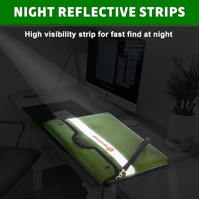 - 6200°F TOP FIRE PROTECTION: Upgraded fireproof money bag with lock has passed Global Flammability Standards (US labs) and Vertical Combustion Testing (SGS UL94 V-1). Recommended by professional firefighters and tested in the most demanding environments. The Upgraded fireproof bag can withstand ultra high temperatures up to 6200°F. It is worth mentioning that the reflective strip of fire proof cash bag has high visibility at night, which is convenient for you to quickly find in a fire