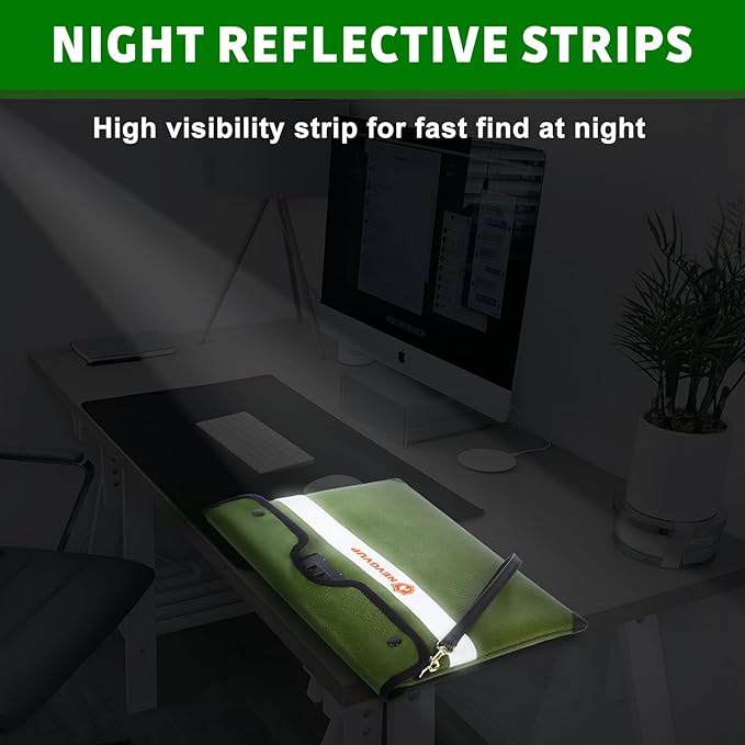 - 6200°F TOP FIRE PROTECTION: Upgraded fireproof bag with lock has passed Global Flammability Standards (US labs) and Vertical Combustion Testing (SGS UL94 V-1). Recommended by professional firefighters and tested in the most demanding environments. The Upgraded fire proof money bag for cash can withstand ultra high temperatures up to 6200°F. It is worth mentioning that the reflective strip of hand-carry fire proof bag has high visibility at night, which is easy to quickly find in a fire