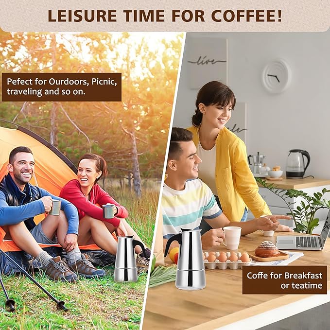 - ☕ ★Suitable for all Hobs★ The Italian coffee maker is suitable for a variety of stoves including induction cooker (The minimum coil requirement for induction is greater than 95mm), ceramic stove, alcohol stove, stove gas, etc.Only 3-5 minutes, you can taste the rich coffee.(Note: It is normal that the stainless steel turns black after use in the fire, it does not affect the use, it can be cleaned with a cleaner stainless steel.)