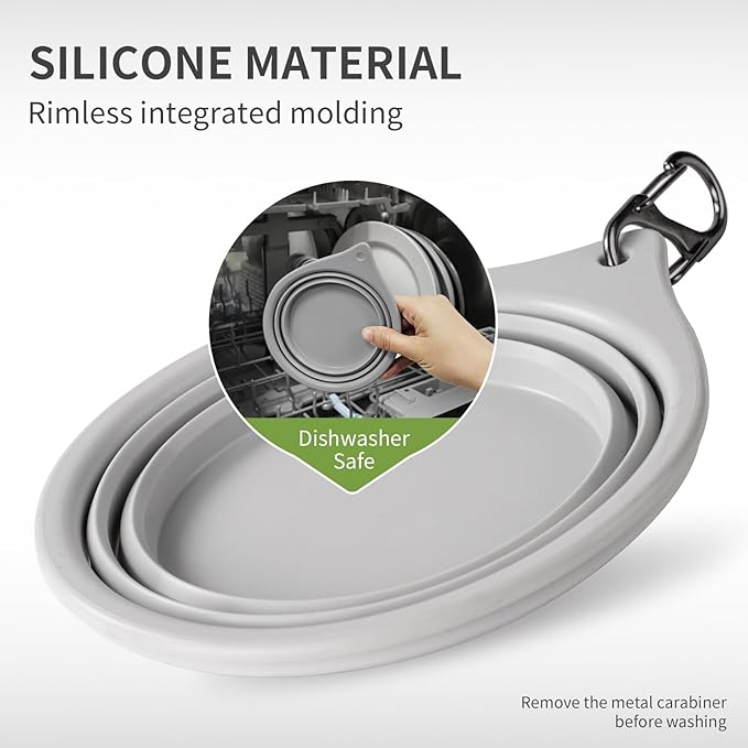 - Collapsible Design : The travel dog bowls can collapse completely flat, easy to storage, clip onto backpack, belt loop, dog leash, put them in your car or vehicle