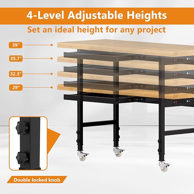- Adjustable Height: This workbench features an easily adjustable height mechanism, allowing you to set the table height between 29" and 39". This flexibility ensures ergonomic comfort, whether you’re sitting or standing, and can be quickly adapted for different users and tasks, enhancing overall productivity and reducing strain during extended work periods.