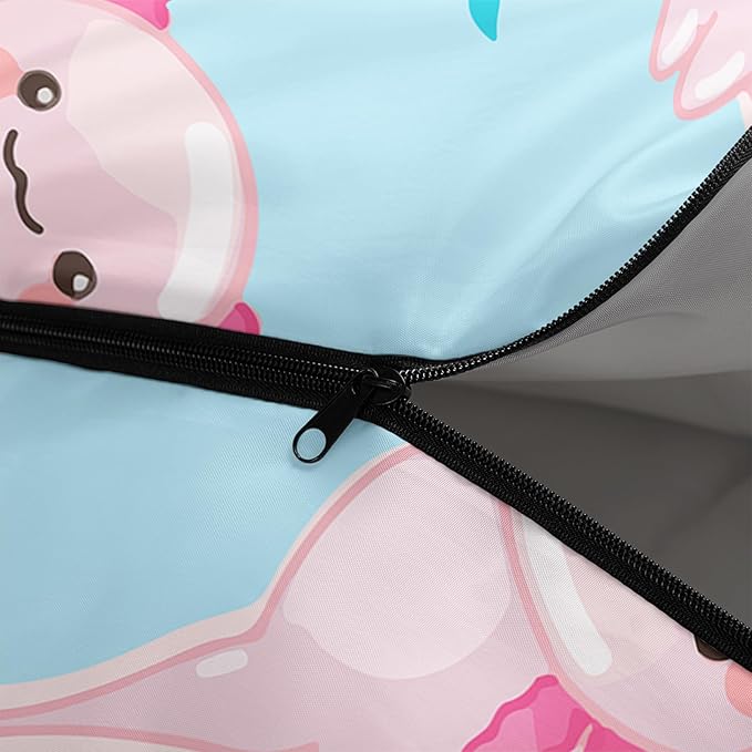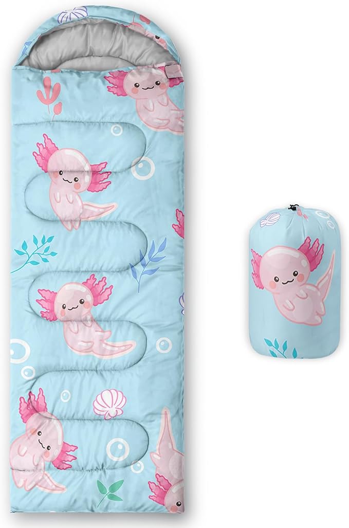- 【Fits For 3 Seasons】: Size - 31 by 90 inches (W x D). Our Ocean Axolotl sleeping bag can be used in 3 seasons with a design temperature of 32℉-77℉(0℃-25℃). These Sleeping bags also have a weather resistant waterproof design to keep you warm and prevent you from any dampness.