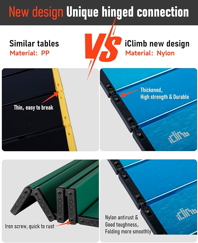 - Ultralight, made of aerospace-grade aluminum alloy, only 3.5 lbs; Max Load 88 lbs; Unlike wooden or nylon-top tables, this table is durable, waterproof, corrosion-resistant, easy to clean; Sturdy joints and connectors, plus anti-slip rubber feet make this table more stable, and the legs won't fold, bend, or disengage on different terrain; Very easy to set up, just open the base frame and attach the table top, enjoy your leisure time in seconds