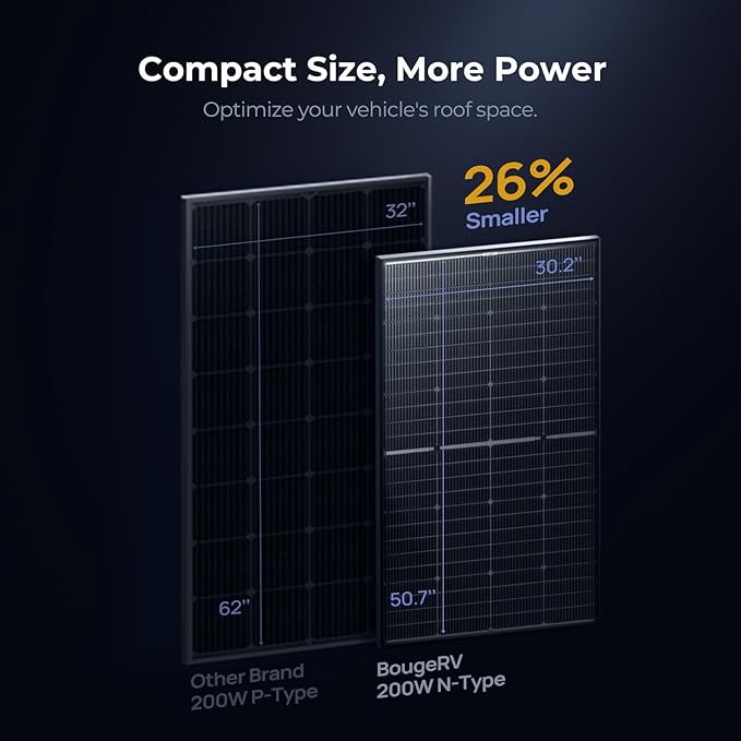 - Compatibility and Wide Usage. Compatible with on-grid and off-grid inverters, the BougeRV N-TYPE 200W solar panel is suitable for powering the house or for outdoor use. Corrosion-resistant aluminum material can withstand the changing outdoor environment and prolong its service life. It is easy to use and mount (pre-drilled holes on the back of the panel), and sophisticated to use with your RVs, boats, and other outdoor equipment. Besides, it is suitable for charging golf cart lithium batteries.