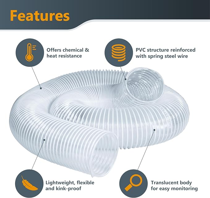 - FLEXIBLE PVC HOSE: Is reinforced with spring steel wire, puncture resistant, while delivering optimal maneuverability and toughness