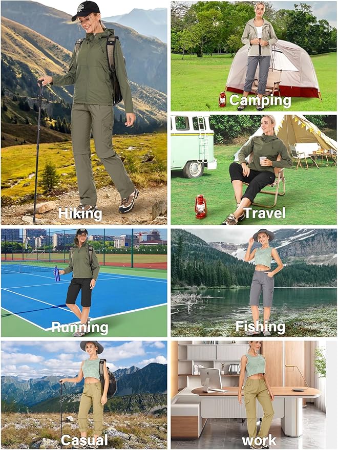 - Convertible hiking pants women: Zip-off legs make for an easy change from pants to shorts, The capri features Roll up around the knee parts to keep cooling when hiking and make the pants hem freely .suitable in the hot and cool seasons of spring summer and autumn.2-in-1 pants can reduce your travel weight. especially suitable for the Summer spring and autumn seasons.