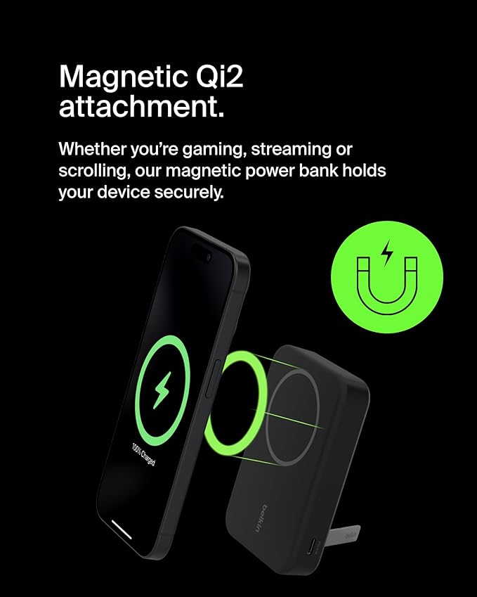 Belkin Portable Charger, Wireless Power Bank 15W 10000 mAh w/ Qi2, MagSafe Charger + Built-in Pop-up Kickstand - Compatible w/iPhone 17, Air, Pro, Pro Max, Google Pixel 10, etc. - Black