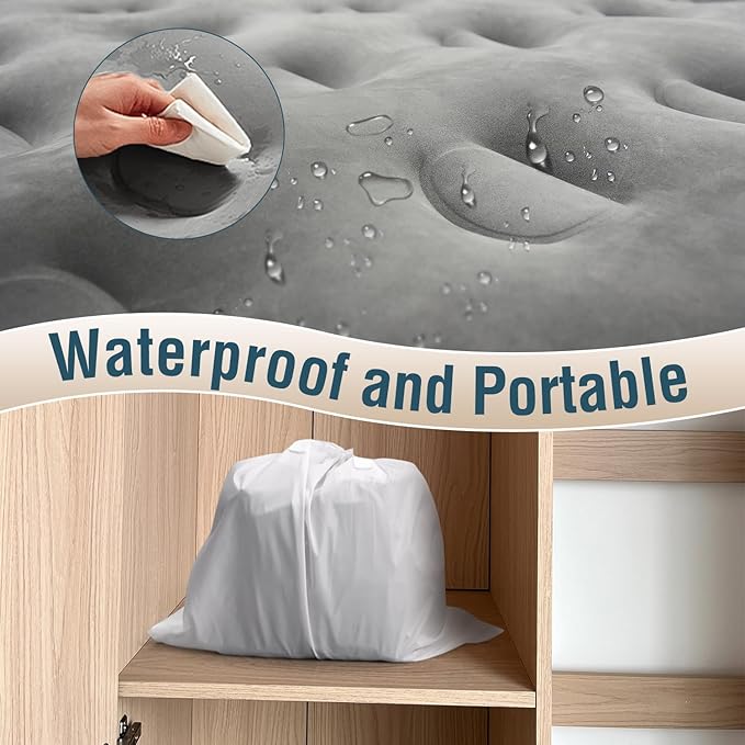 - Excellent Sleeping Experience: The top of 18 inch Air Mattress Queen is made of high quality flocked fabric, which is waterproof, odor-resistant and easy to clean. Sleeping on this Queen Size Inflatable Bed will not only provide you with a skin-friendly soft feeling, but also like mother giving you a kind hug.