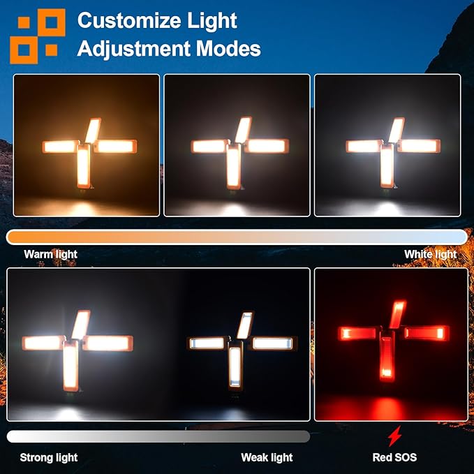- 【Brightness and adjustable dimness】Equipped with Max 4 X 2000 Lumens, this product offers stepless dimming options, allowing you to adjust the brightness to your desired level. Its four light modes, White/Warm/Nature White/RED(SOS), provide optimal illumination for any situation.