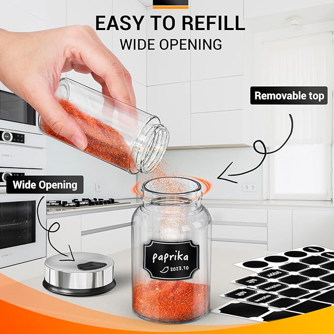 - Clear Empty Spice Containers: Our spice storage containers are crafted from high-quality thickened glass, ensuring their durability and sturdiness. Seasoning shakers protects the spices from light, moisture and air, keeping them fresh and flavourful for longer.The transparency of the spices shakers enhances the kitchen's aesthetic and allows you to quickly identify and locate specific spices, ensures that you can clearly see the spices in the bottle, so that you can refill it in time.