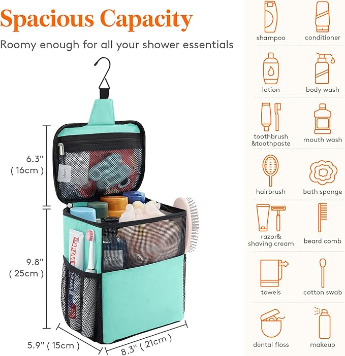 - Spacious Capacity: The overall dimensions of the medium shower bag are 8.3"(21cm) x 5.9"(15cm) x 9.8"(25cm), which holds up to 4 full-size bottles of shampoo, conditioner, lotion, and body wash; the large mesh shower caddy measures 9.8"(25cm) x 6.5"(16.5cm) x 11.4"(29cm), with 2 side pockets, it offers larger capacity for all kinds of toiletries, like skin care products, toothpaste, toothbrushes, hairbrush, shaving accessories, towels, slippers, etc.
