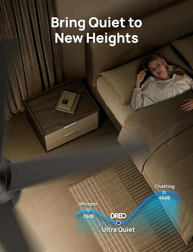- Runs Smooth and Quiet: Dreo's Brushless DC Motor runs with less friction and optimized efficiency, achieving natural wind with noise levels lower than whisper sound, perfect to install in quiet places like bedrooms or living rooms.