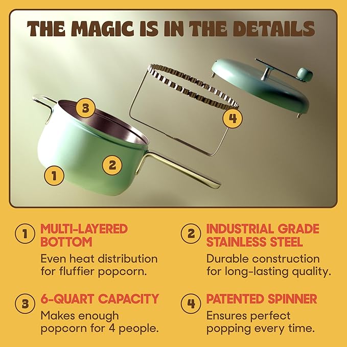 - Easy to use and clean - You can use the Popper on any stove — even induction. Just heat, pour the ingredients, turn, and enjoy the best popcorn you’ve ever had! Cleanup is a breeze since the entire pot is dishwasher safe.