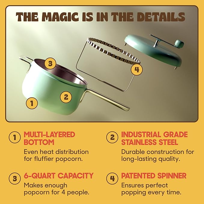 - PREMIUM PERFORMANCE - Our stainless steel popcorn popper with a multi-layered metal bottom ensures fast, even heat distribution while our patented spinner keeps kernels from burning. Simply heat, pour, turn, pop, and repeat!