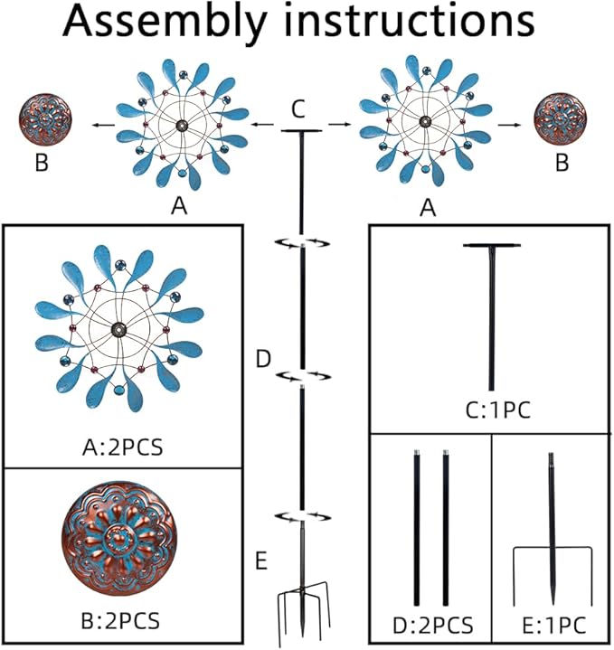 - Weather Resistance:This wind spinner can be used in hot, rainy, snowy and any other weather because of rust-proof layer, and 4 sturdy stake can ensure that the garden windmill can be used normally on windy days