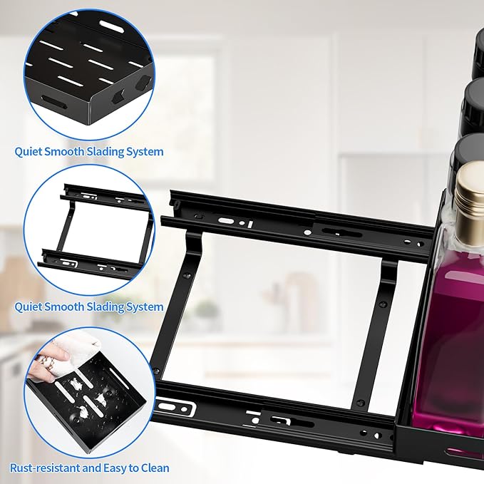 - Quiet Sliding and Compatible with More Cabinets: Our vertical spice rack pull out is design with a quiet ball bearing system that ensures a smooth and noiseless slide out, so you can easily pull put spice rack slide out. The full-extension slides allow you to easily access all the spices in your cabinet. The upgraded seasoning organizer, with a raised bottom design, is compatible with cabinet frame that are slightly higher than the inside of the cabinet, making it perfect for use and the perfect spice storage solution for almost any cabinet.