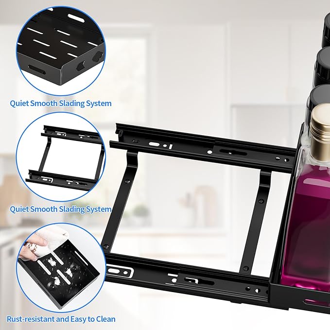 - Quality Metal, Shelf Design: The 1 tier pull out spice rack organizer is made of quality all-metal material, which is long term use and enhances the usage time. The unique plate design of the spice rack can well ensure that the spice bottles are steady placed neatly.
