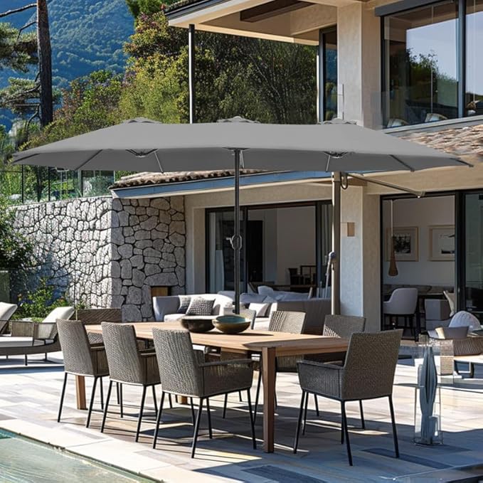 - EXTRA-LARGE SHADING AREA: This double umbrella outdoor patio can be used with 4-6 person patio dining set or outdoor furniture set. Ideal for family gatherings, outdoor dining or relaxing, it can provide ample shade area for your family and friends.