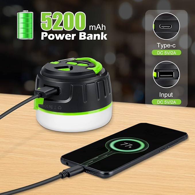 - ✅【5200mAh Capacity Battery】Rechargeable camping light is equipped with a high-quality 5200mAh battery, This Led lantern not only provides reliable illumination but also serves as a convenient emergency power supply for charging mobile devices, providing up to 150 hours of low-brightness illumination for extended outdoor adventures.