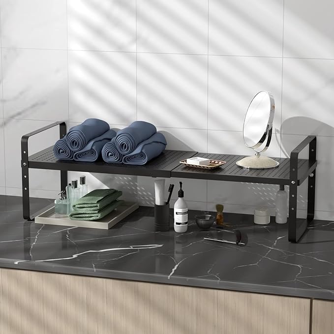 - MULTI-FUNCTIONAL EXPANDABLE ORGANIZER SHELF: It can be a rack or shelf to meet your organizational purpose. The surface has a mesh design, which can achieve the effect of draining. It is an excellent organizer of plates, bottles, cans, pots and pans. It is also a spice shelf for storing snacks, spices, condiments, fruits, etc. It is also the perfect organizer of the dresser. It will make your countertop more clean and tidy.
