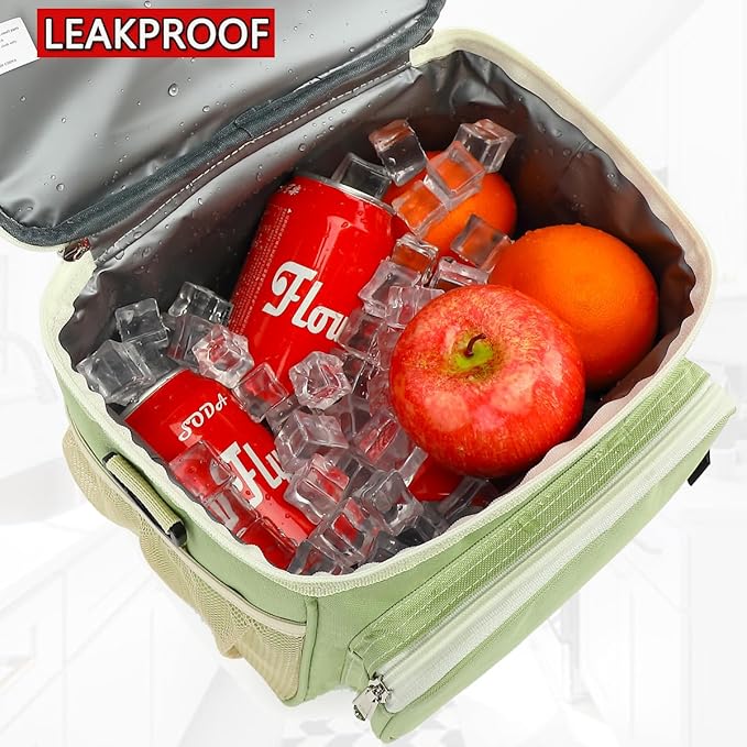 FlowFly Insulated Reusable Lunch Bag Adult Large Lunch Box for Women and Men with Adjustable Shoulder Strap,Front Zipper Pocket and Dual Large Mesh Side Pockets,Light Matcha