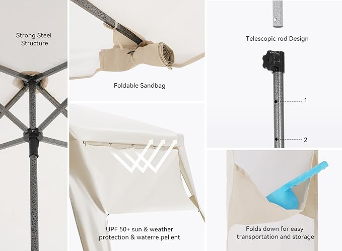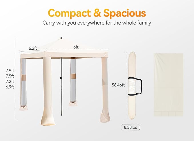 - 4 Adjustable Height: The Vibemo cabana beach tent sun shelter offers 6.9ft, 7.2ft, 7.5ft and 7.9ft height adjustment options, providing enough choices to find the most suitable height.