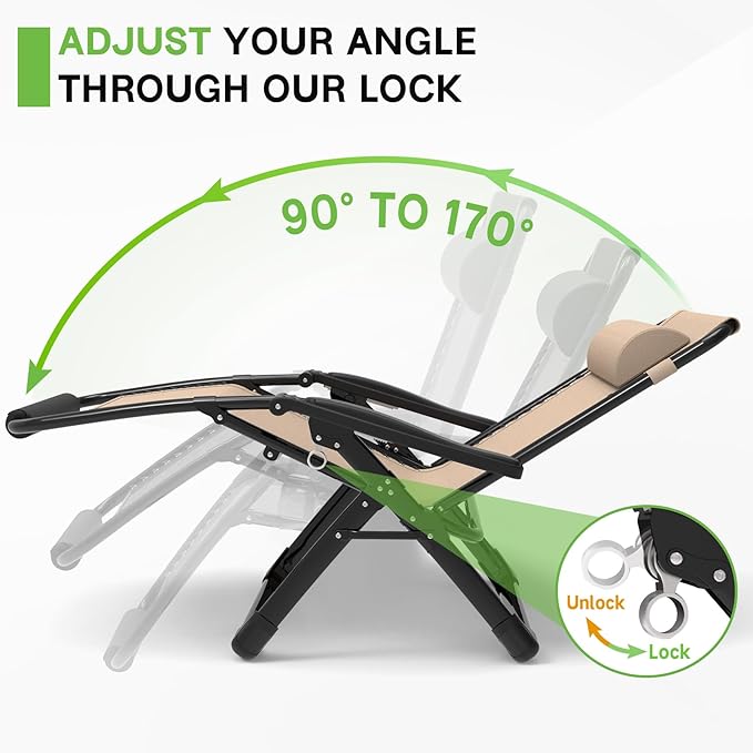 - 【Experience Zero Gravity Comfort】Melt into the cloud-like embrace of our adjustable angle zero gravity recliner, designed to cradle your body and reduce spinal strain. Adjust the 90-170° angle to find your perfect position, whether you're unwinding by the pool or enjoying a serene moment in your garden.