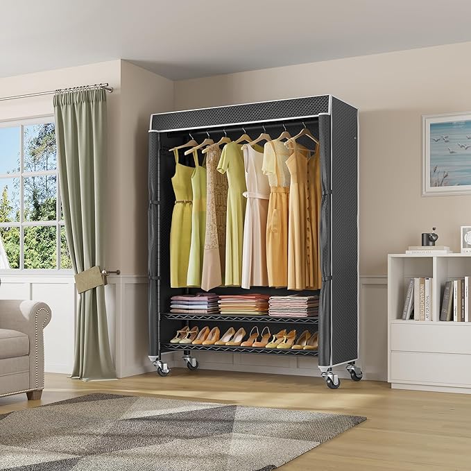 - 【Zippered Polyester Fabric Cover】Closet comes with upgraded polyester fabric cover, sturdy, wrinkle resistance, breathability keep garments dry. Easy to clean with damp cloth, and to keep your item away from dust.